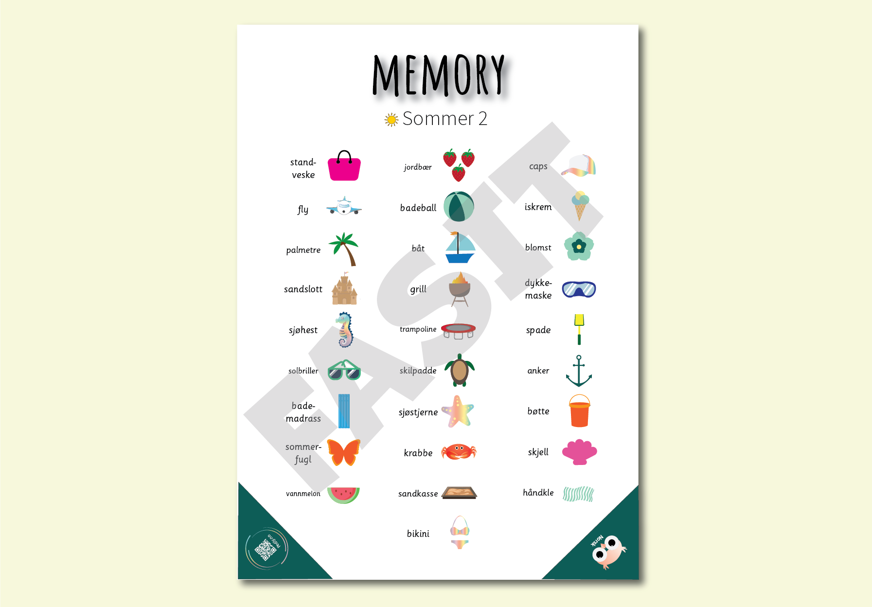 I dette memory-spillet får elevene trening i hukommelse, lesing og begreper, ved å knytte sammen ting som omhandler sommeren. Tekst skal knyttes til riktig bilde og motsatt. Dette spillet egner seg godt til både stasjonsarbeid, arbeidsøkter og som et alternativ til lesekvart.